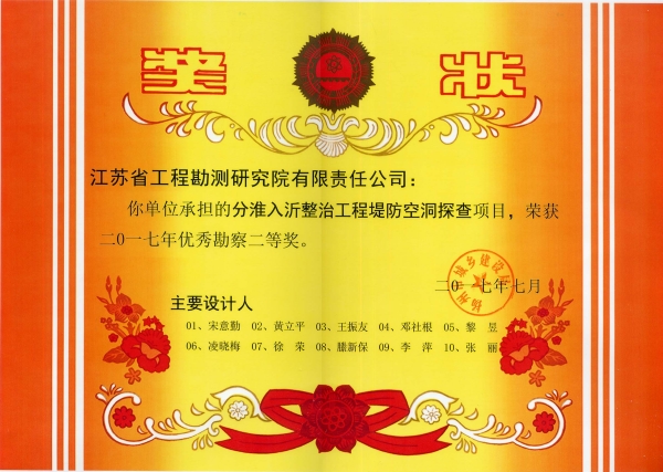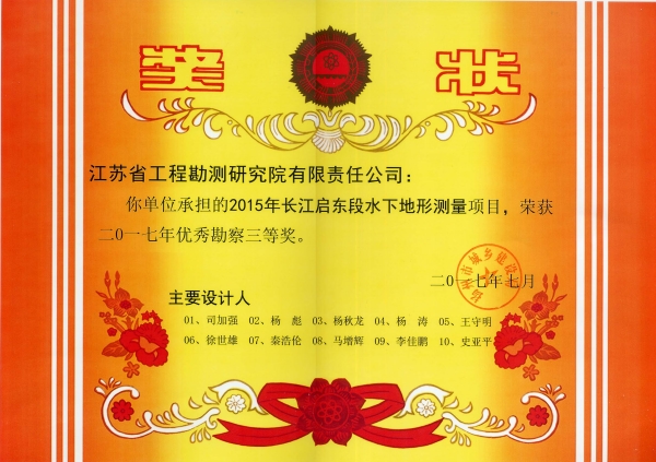 近日,扬州市城乡建设局公布2017年市优秀勘察设计奖评选结果,我公司有三个工程项目获市级优秀工程勘察奖。获奖的工程项目分别是“扬州市城市抗震防灾规划工程地质勘察”项目荣获优秀勘察一等奖,“分淮入沂整治工程堤防空洞探查”项目和“2015年长江启东段水下地形测量”项目分别获得优秀勘察二等奖和三等奖。
